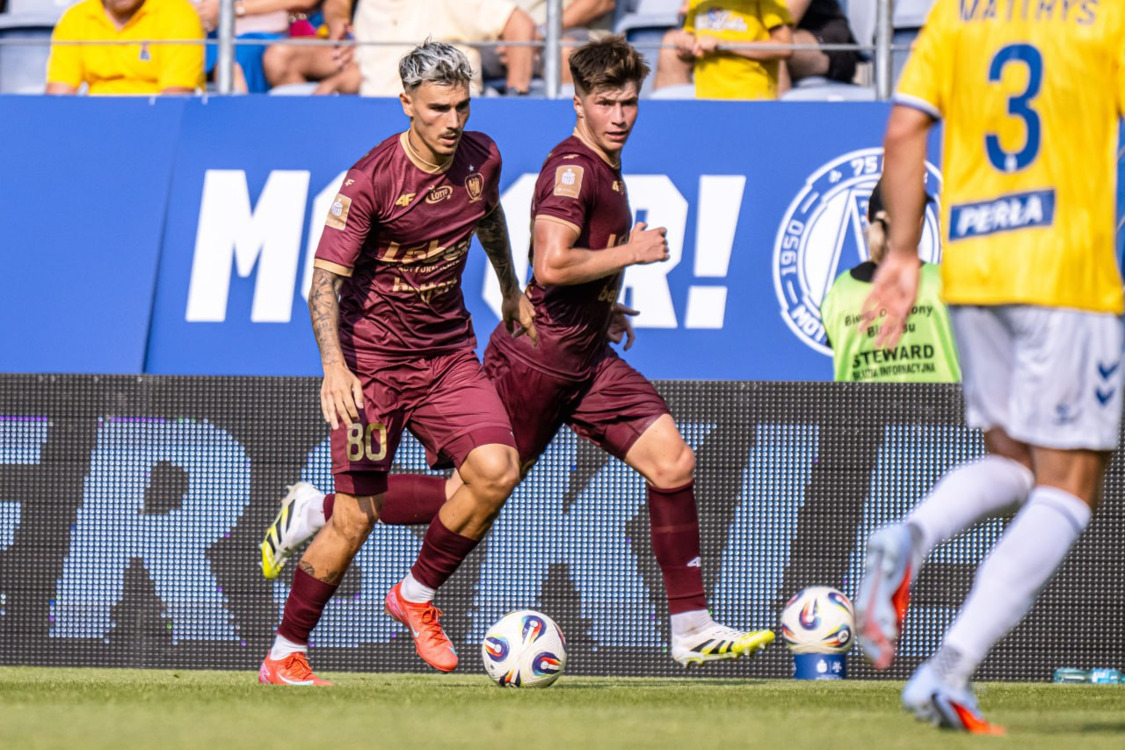 - W pierwszym meczu wyjazdowym w sezonie trener Max Mölder dokonał dwóch zmian w wyjściowej jedenastce względem ostatniego domowego meczu z Wisłą Płock. Między słupkami stanął Frantisek Plach. Przed nim zagrała czwórka obrońców: Ema Twumasi, Jakub Czerwiński, Igor Drapiński i Jakub Lewicki. W pomocy ustawieni byli Michał Chrapek, Patryk Dziczek i Quentin Boisgard. Tercet ofensywny stworzyli: Erik Jirka, Leandro Sanca i German Barkovskiy.